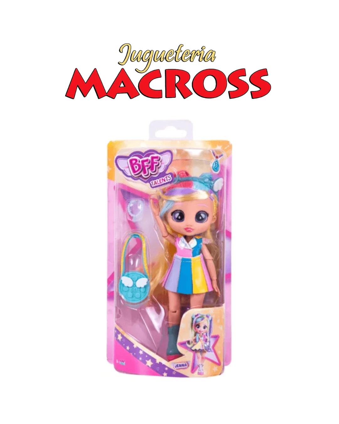 La muñeca BFF Talents Jenna (Serie 3) es una figura de 20 cm de los Bebés Llorones que representa a Jenna como una estrella de cine o actriz. Cuenta con cabello de nailon, ojos de cristal, cuerpo articulado y viene con más de 9 sorpresas, incluyendo ropa, accesorios y un empaque que funciona como armario