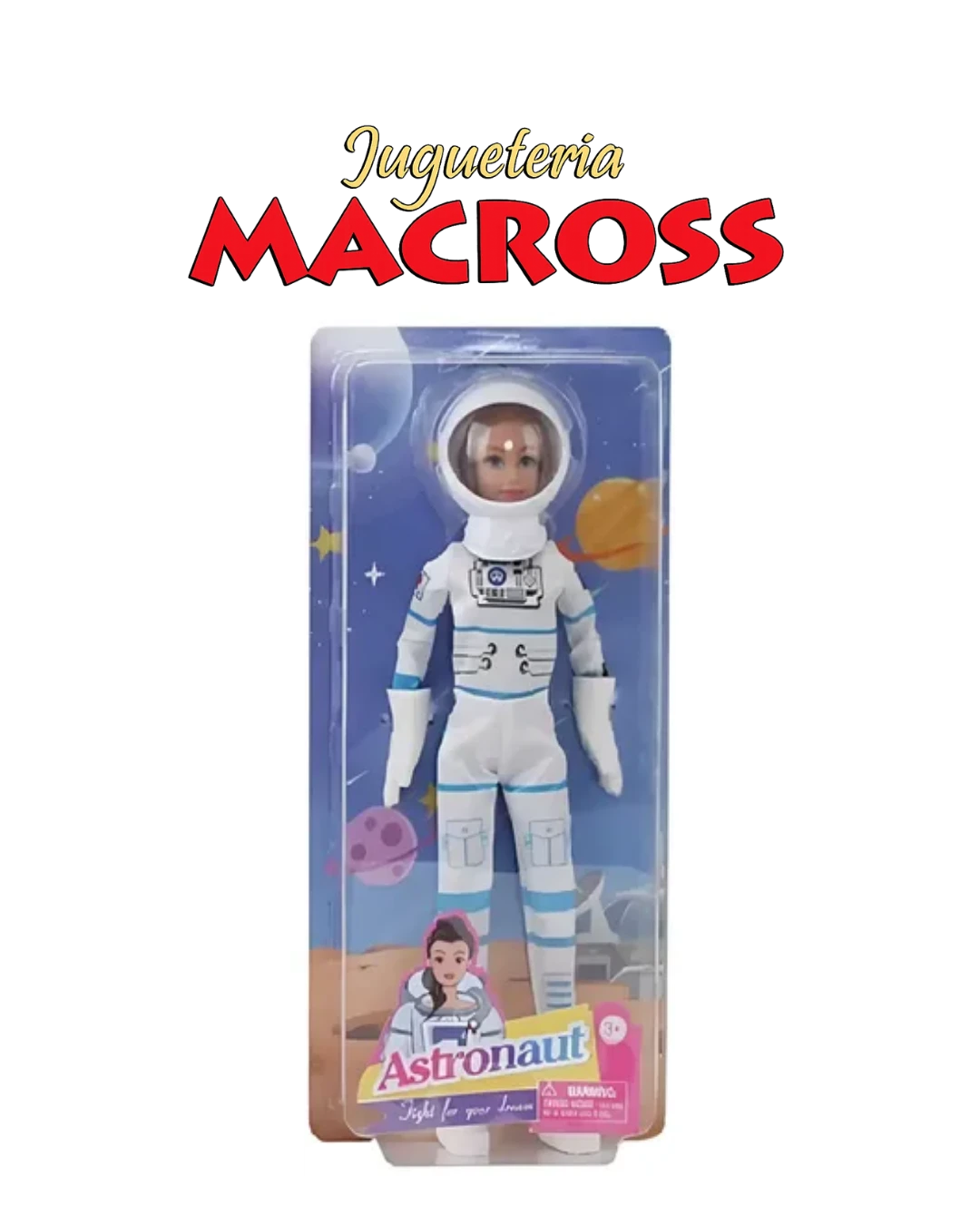 Incluye traje espacial, mide aproximadamente 28 cm a 33 cm, y está recomendada para niños mayores de 3 años.