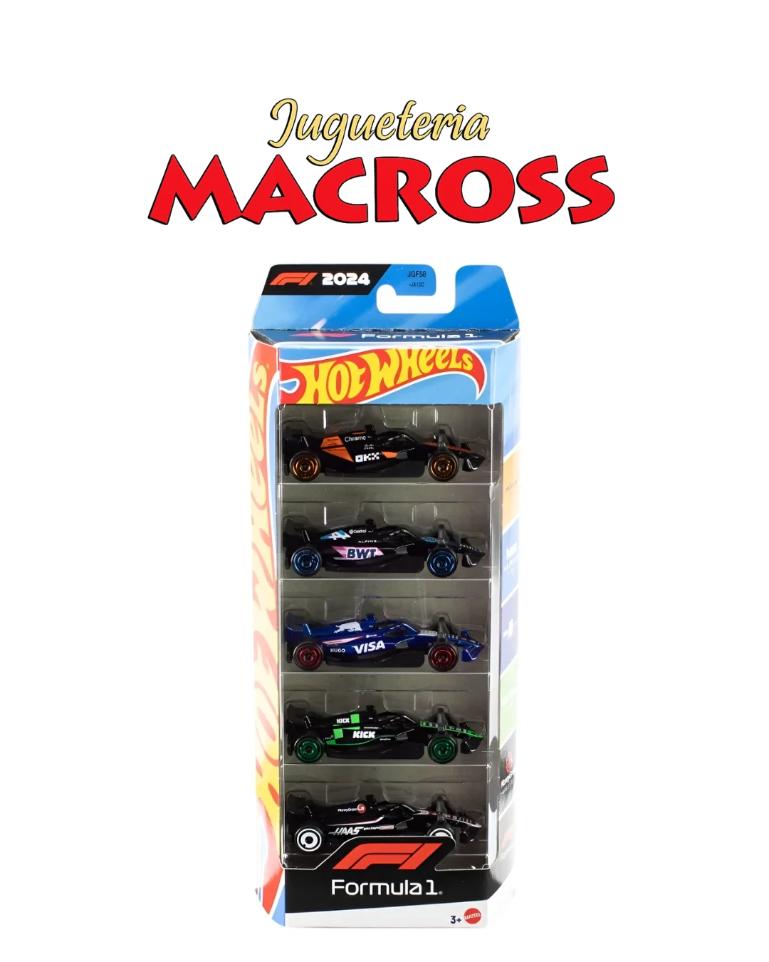 Incluye cinco vehículos metálicos que representan equipos destacados como McLaren F1, Visa Cash App RB, KICK Sauber, MoneyGram Haas y BWT Alpine.
