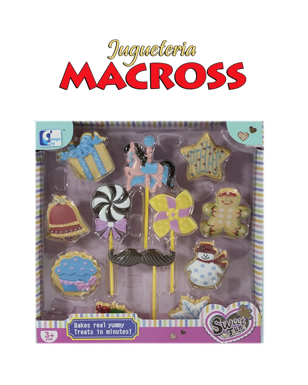Incluye 12 piezas de plástico, entre las que se encuentran 8 masitas y 4 paletas. El set está diseñado para juegos de simulación de cocina. La edad recomendada para su uso es a partir de los 3 años.