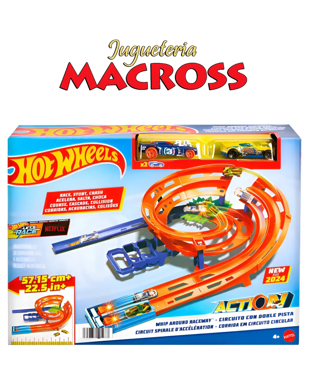 set de pista Hot Wheels Action Whip Around Raceway (Circuito Giro Veloz) de Mattel. Incluye dos vehículos Hot Wheels a escala 1:64 para carreras cara a cara y acrobacias. Cuenta con una pista de doble carril con un salto sobre obstáculos y una zona de choque. El conjunto se pliega por la mitad e incluye un asa con espacio para guardar los dos autos.