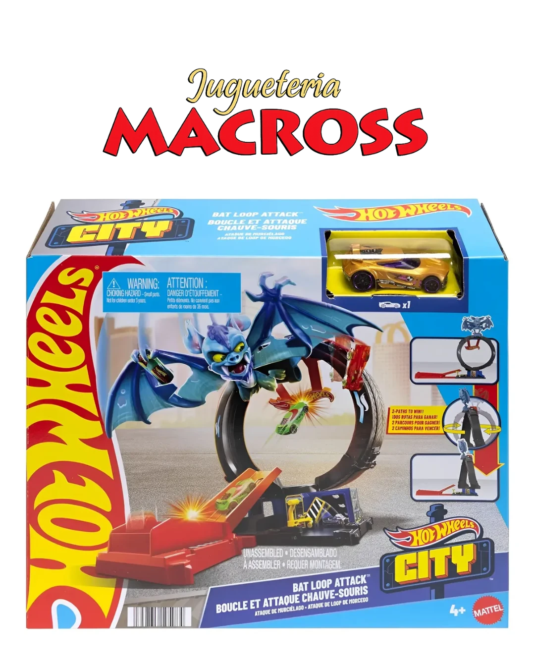 set de pistas Hot Wheels City Bat Loop Attack. Incluye un vehículo a escala 1:64, una pista con bucle giratorio y un lanzador ajustable.