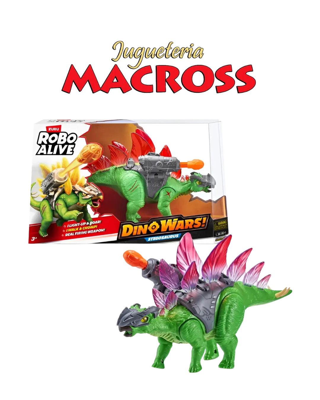 El Zuru Robo Alive DinoWars Stegosaurus es un juguete robótico interactivo que camina y ruge de forma realista. Presenta placas dorsales iluminadas, ojos detallados y viene equipado con un lanzador de proyectiles (dino blaster) que dispara hasta 2 metros, además de armadura defensiva removible, ideal para niños a partir de 3 años